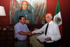 Morelia, Mich., 26 de abril del 2012.- En atención a la política de puertas abiertas y para escuchar las opiniones de todas las fuerzas productivas y académicas, el gobernador Fausto Vallejo Figueroa sostuvo un encuentro con miembros del Sindicato de Profesores de la Universidad Michoacana (SPUM), presidido por el secretario general de dicho organismo, Erasmo Cadenas Calderón.
