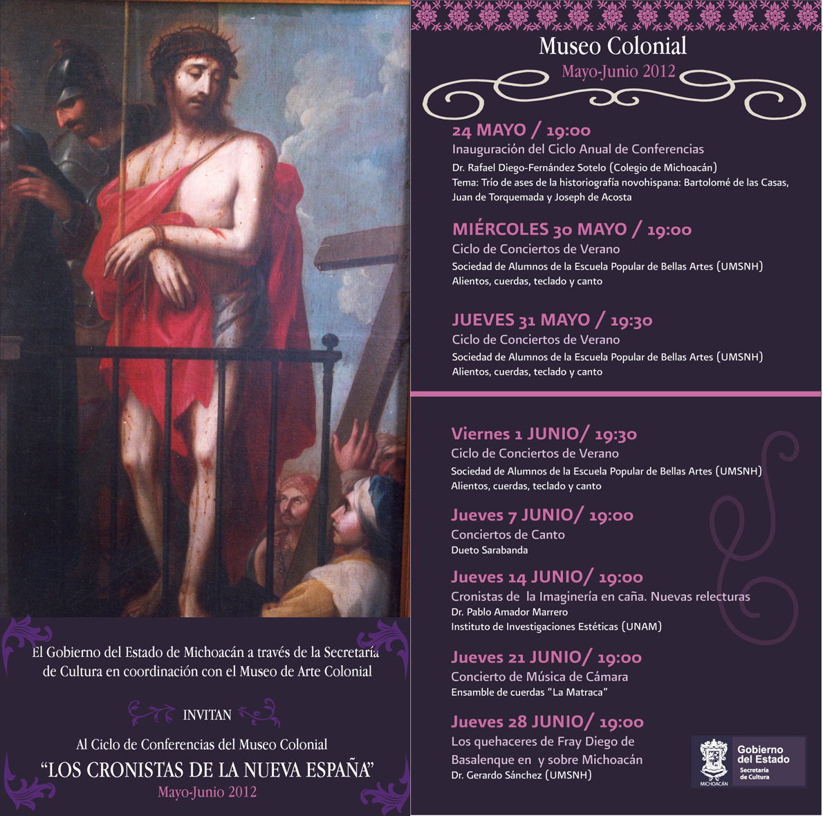 Morelia, Mich., 24 de mayo del 2012.- Del 24 de mayo al 27 de septiembre del 2012 el Museo de Arte Colonial realizará el ciclo de conferencias “Los cronistas dela Nueva España”, en el que se contará con la participación de investigadores de diversas instituciones educativas, quienes hablarán sobre la historia, el legado y la crónica realizada por algunos frailes de diferentes órdenes del clero regular, cuya labor fue conformando a la sociedad, durante la época del Virreinato.