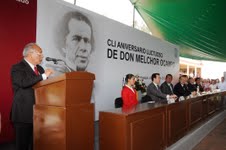 Pomoca, mpio. de Maravatío, Mich., a 3 de junio de 2012.- El gobernador del estado, Fausto Vallejo Figueroa asistió al CLI aniversario luctuoso de Don Melchor Ocampo, quien en materia de educación sostenía que ésta tenía que cimentarse en estos postulados básicos del Liberalismo: en la democracia o gobierno de la mayoría; en el respeto a las diferentes creencias religiosas; en la tolerancia; y en la igualdad de todos ante la ley, fortaleciendo la autoridad civil y suprimiendo los privilegios.