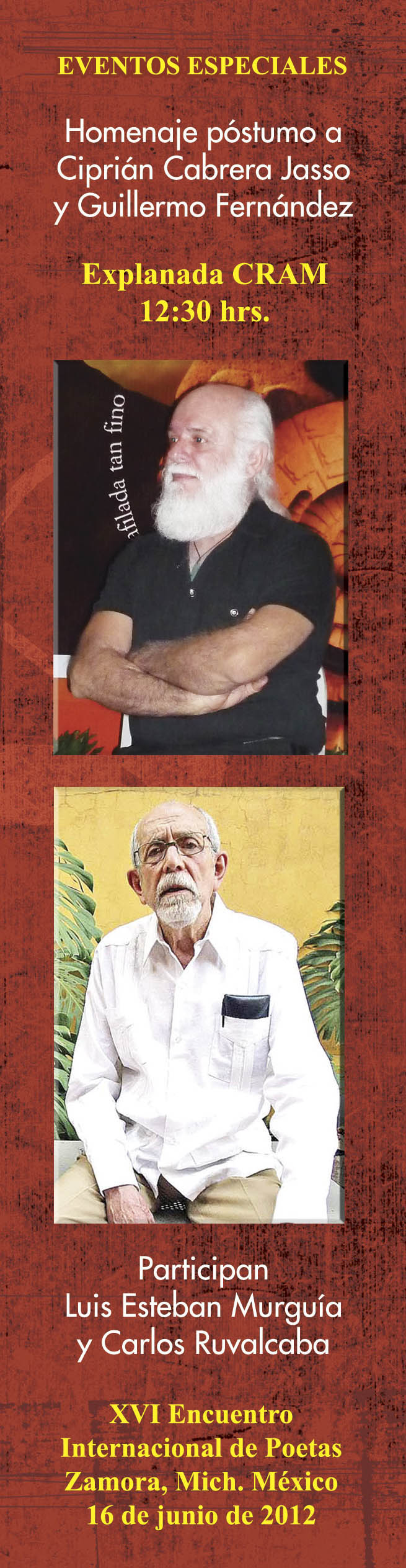 El sábado 16, la jornada de trabajo comenzará a las 10:00 horas con la presentación de obras literarias impresas. Después, con las participaciones de Luis Esteban Murguía y Carlos Ruvalcaba, se rendirá homenaje póstumo a dos poetas fallecidos recientemente, el tabasqueño Ciprián Cabrera Jasso y el tapatío Guillermo Fernández, a las 12:30 horas en la explanada del CRAM.