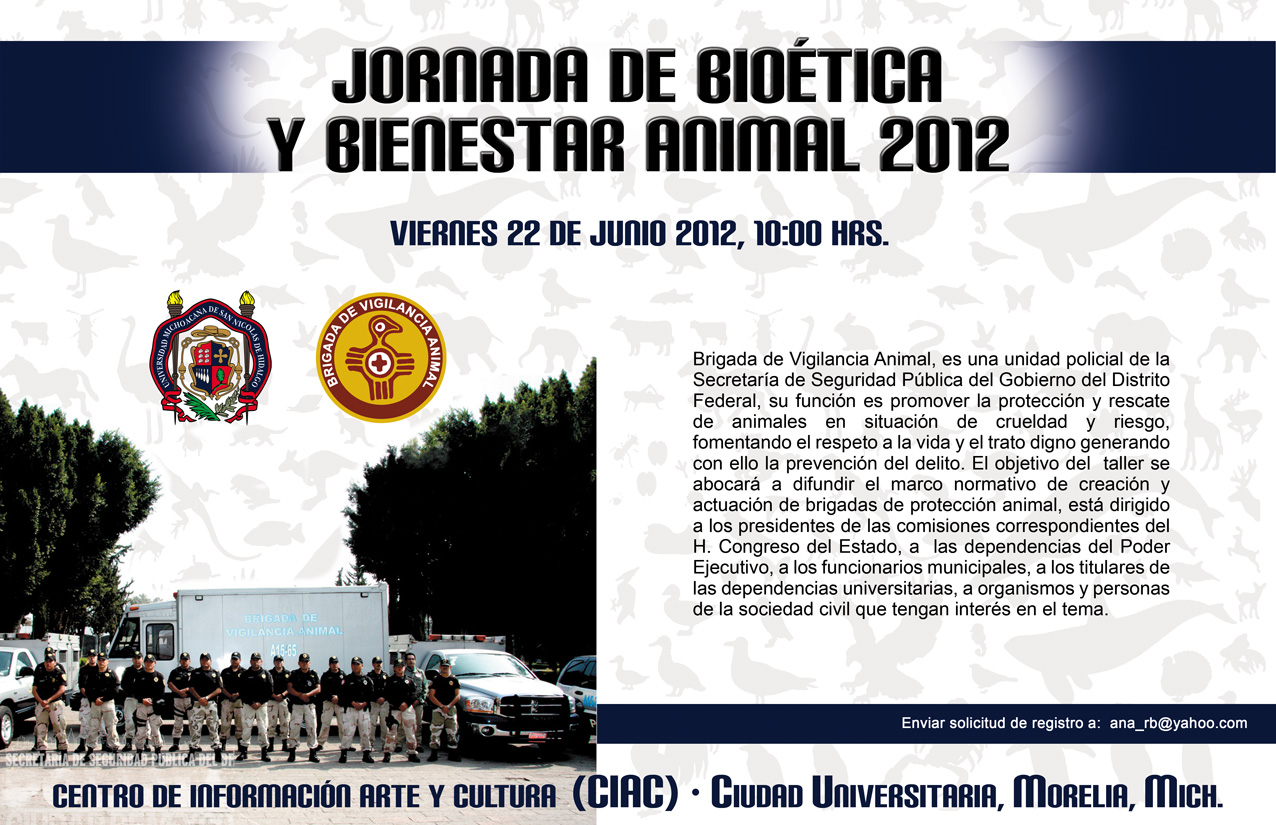 Morelia,Michoacán.- 15 de Junio de 2012.- Con la finalidadde dar continuidad al trabajo que se desarrolla como parte de las Jornadas de bioética y bienestar animal, encaminadas a impulsar a través de diversas actividades académicas la salud en este ámbito, se llevará a cabo el taller Brigada de Vigilancia Animal el 22 de junio a las 10:00 horas en elCentro de Información Arte y Cultura (CIAC), de Ciudad Universitaria.
