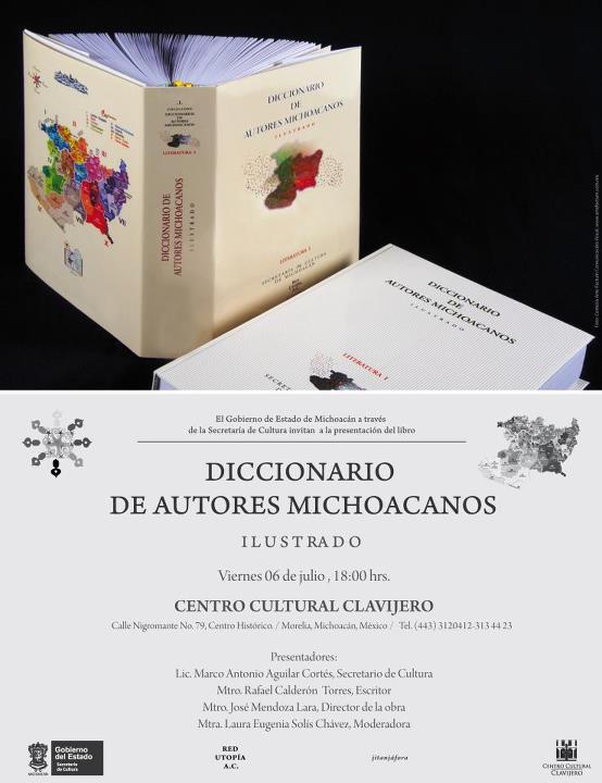 Morelia, Mich., 05 de julio 2012.- El día 06 de julio será presentado el «Diccionario de Autores Michoacanos», editado por el Centro de Documentación e Investigación de las Artes de Michoacán, será a las 18:00hrs, en el auditorio del Centro Cultural Clavijero.
