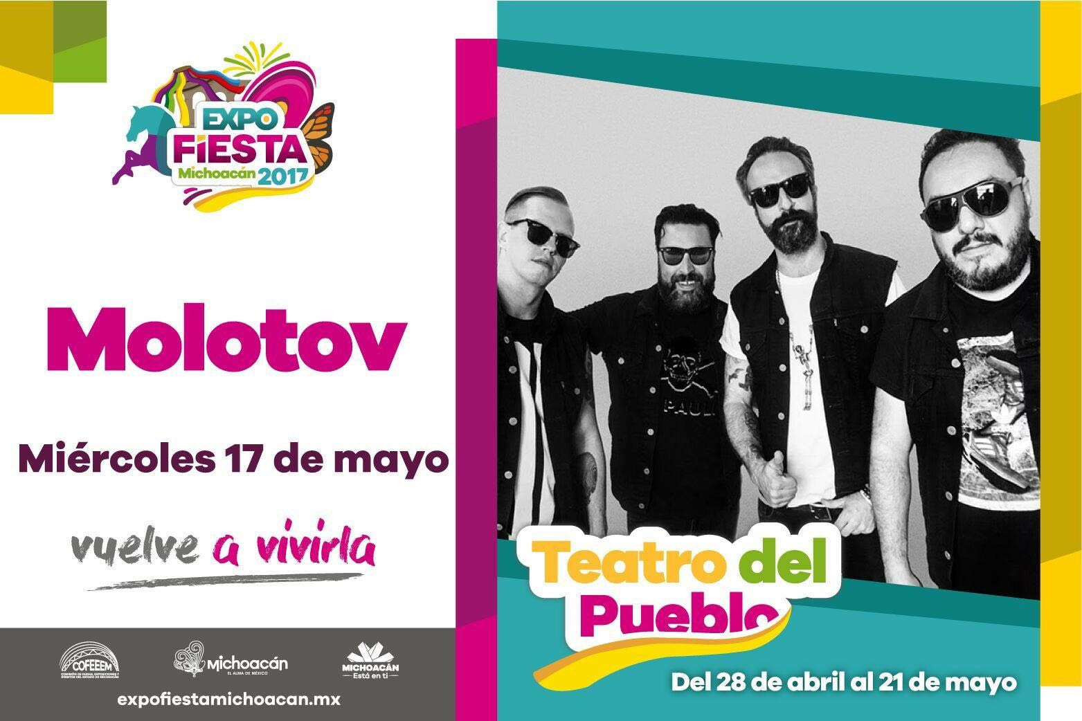 Morelia, Mich., 17 de mayo de 2017.- Está noche el Teatro del Pueblo de la Expo Fiesta Michoacán 2017 vibrará al ritmo de rock con todos los éxitos de Molotov.