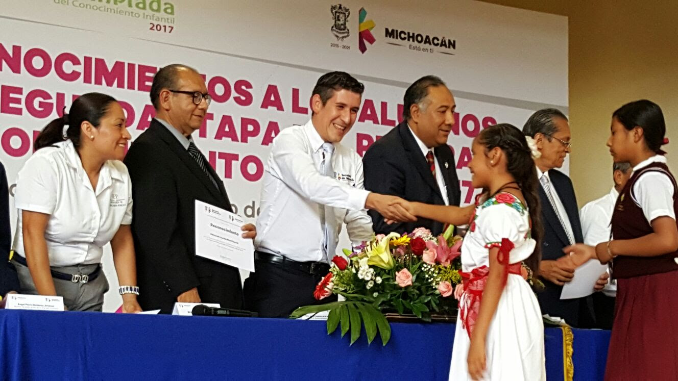 Durante la ceremonia, Víctor Hugo Guzmán Ayala, director de Educación Primaria de la SEE, felicitó y reconoció a los alumnos condecorados a nombre del titular de los servicios educativos en Michoacán, Alberto Frutis Solís, por su dedicación y esfuerzo, y los conminó a seguir por el sendero del conocimiento, el cual los llevará a ser hombres de bien para el desarrollo de nuestro estado.