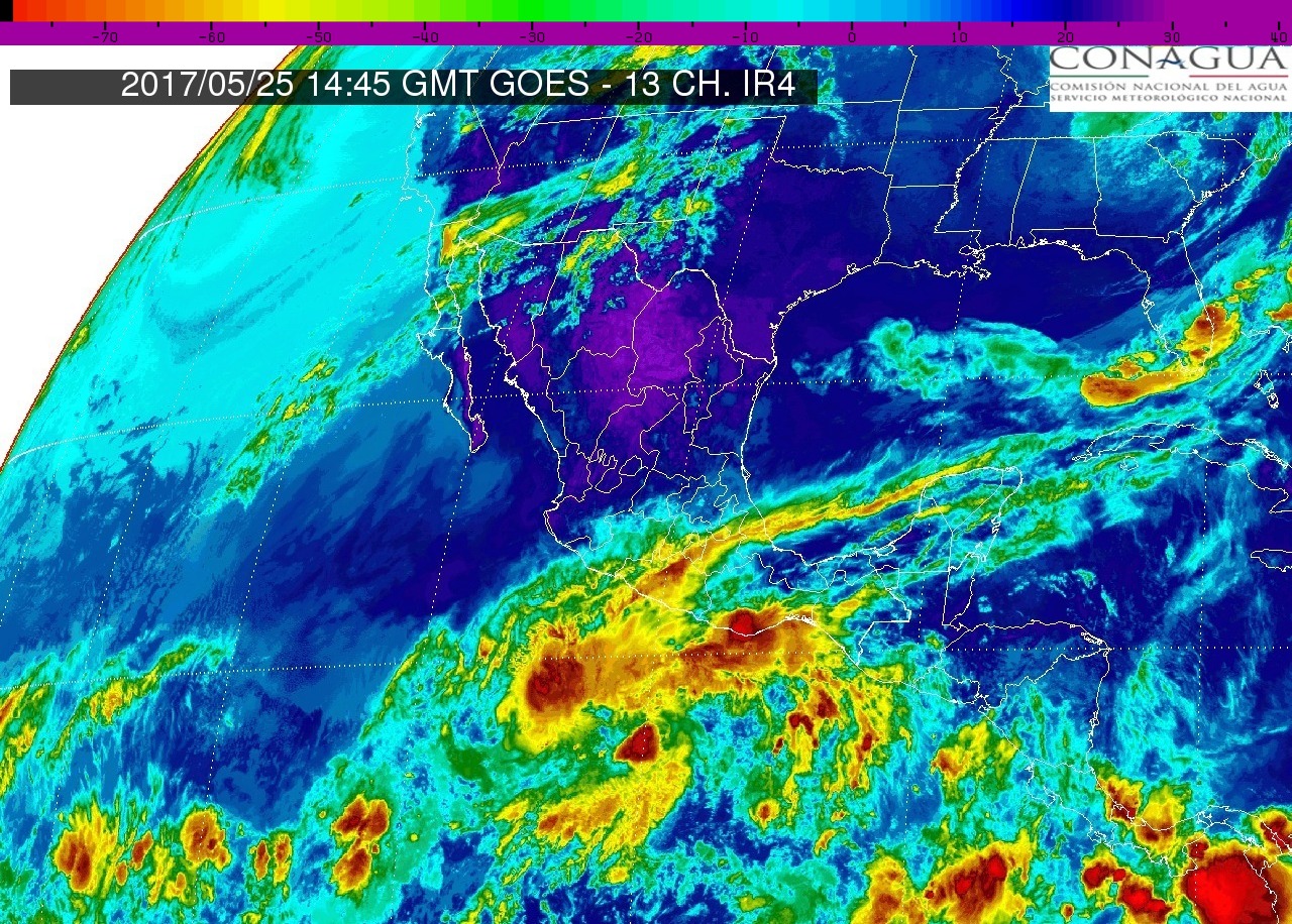 CDMX, 25 de mayo del 2017.- Durante este día jueves, continuará el potencial de tormentas puntuales fuertes a muy fuertes en entidades del centro, sur y sureste del Territorio Nacional, así como en la Península de Yucatán; efectos que pueden acompañarse de actividad eléctrica, caída de granizo y rachas de viento superiores a 60 km/h durante el paso de los sistemas de tormenta. No obstante, también dominará ambiente caluroso a muy caluroso en el occidente y sureste de México, además de en dicha península. El viento será del sur y sureste en Tamaulipas, Veracruz, Campeche, Yucatán y Quintana Roo, con ráfagas que pueden superar los 60 km/h, y de la misma intensidad, con posibles tolvaneras, en estados del noroeste del país. Todo esto será ocasionado por el sistema frontal No. 49, que se extenderá con características de estacionario sobre la Península de Yucatán, en combinación con un canal de baja presión en el interior del país, y una circulación anticiclónica sobre el Golfo de México.