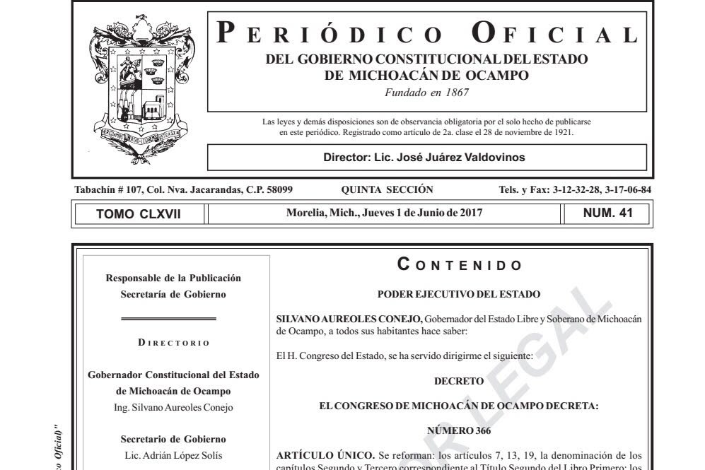 En la búsqueda permanente de la transparencia, del derecho a la información pública y de la promoción a la certeza jurídica, el Gobierno del Estado, que encabeza Silvano Aureoles Conejo, publicó estas reformas a la legislación electoral vigente, mismas que podrán ser consultadas en el portal web de la administración estatal (www.michoacan.gob.mx), así como en el Catálogo Electrónico de la Legislación del Estado de Michoacán (celem.michoacan.gob.mx).