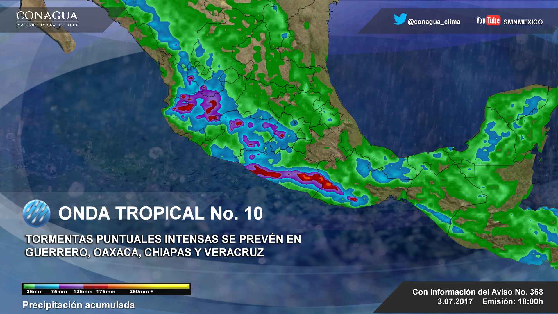 CDMX, 03 de junio del 2017.- Para esta noche de lunes, prevalecerá amplia zona de nublados con tormentas puntuales intensas acompañadas de actividad eléctrica, posibles granizadas y rachas de viento en Veracruz, Guerrero, Oaxaca y Chiapas; muy fuertes en Jalisco, Colima, Michoacán y Puebla y fuertes en Sonora, Chihuahua, Durango, Sinaloa, Nayarit, Guanajuato, Querétaro, Tlaxcala, Estado de México, Ciudad de México, Morelos, Tabasco, Campeche, Yucatán y Quintana Roo, originadas por la onda tropical No. 10, localizada al sur de Oaxaca y un canal de baja presión sobre el interior del territorio.