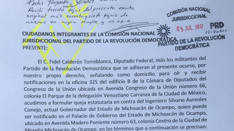 La queja presentada ante la Comisión Nacional Jurisdiccional del PRD establece, entre otros puntos que la firma de Aureoles Conejo en el Pacto por México no fue autorizada ni aprobada por los órganos de dirección del Partido, así como que la reciente posición del gobernador respecto a la política de alianzas para la elección de 2018, de apuntar a una alianza con el PRI, es diametralmente opuesta a la Línea Política definida de manera consistente por los órganos de dirección del Partido, siendo que desde los años 2015 y 2016, se estableció que las alianzas políticas, sociales y electorales del PRD con otras fuerzas estarán orientadas, principalmente, hacia otros partidos de izquierda, hacia las múltiples organizaciones sociales, civiles y, especialmente, hacia todas y todos los ciudadanos que comparten una identidad democrática, libertaria, progresista e igualitaria, ello con el objetivo de impulsar el programa del PRD y fomentar el avance de la izquierda en el país; que entonces como ahora no existe propósito alguno de establecer alianzas electorales de carácter general con el Partido Acción Nacional, mucho menos con el PRI con el cual de manera tajante se estableció que bajo ningún motivo o concepto se pueden establecer alianzas electorales.