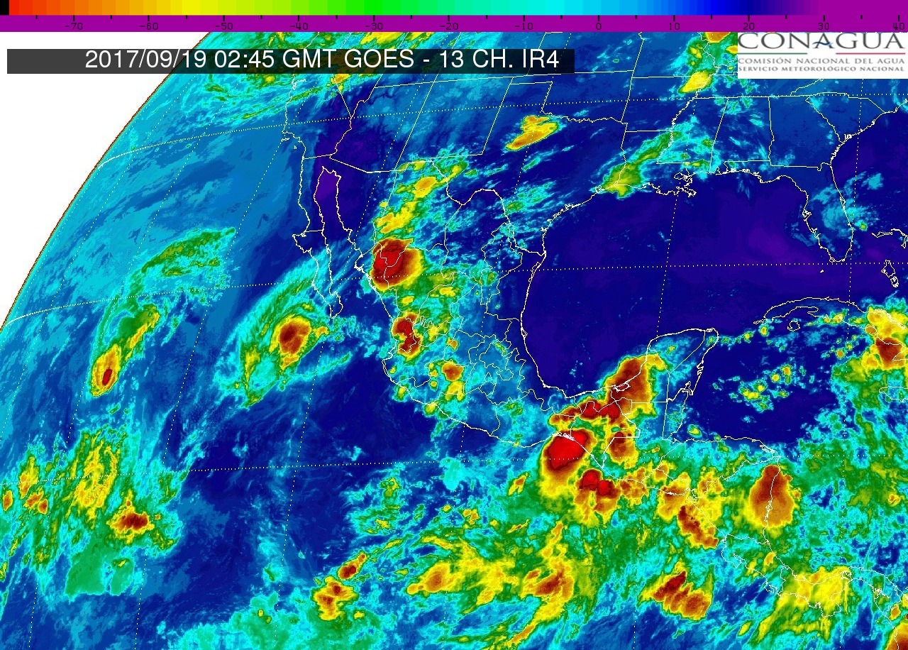 CDMX, 18 de septiembre del 2017.- Durante esta noche de lunes y madrugada se prevén valores de temperatura menores a 5°C en estados del interior del territorio. Olejae de 1 a 2 m de altura y rachas de viento superiores a 50 km/h en el sur de Baja California Sur. Se prevé también el desarrollo de tormentas con actividad eléctrica y acumulados de lluvia intensa en Chiapas, Oaxaca, Veracruz y Tabasco; muy fuertes en Sinaloa, Guerrero, Puebla y Campeche; y fuertes en Baja California Sur, Sonora, Chihuahua, Nuevo León, Zacatecas, Durango, Nayarit, Jalisco, Colima, Michoacán, Guanajuato, Querétaro, Hidalgo, Tlaxcala, Estado de México, Ciudad de México, Morelos, Yucatán y Quintana Roo, además de lluvias y chubascos en zonas del norte de México. Estas condiciones serán originadas por la Tormenta Tropical «Norma», la onda tropical No. 34 y un canal de baja presión.