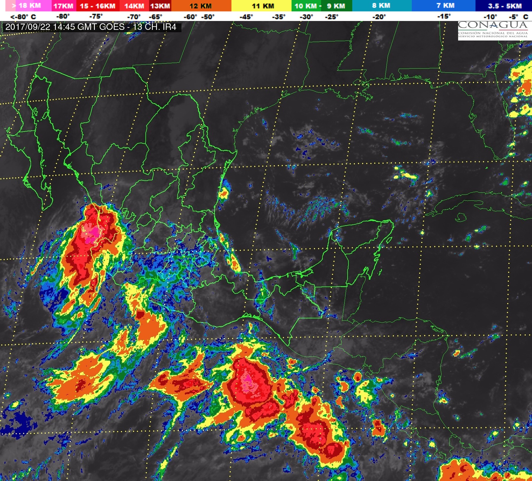 CDMX, 22 de septiembre del 2017.- Durante este día viernes, se prevé ambiente caluroso sobre los estados del noreste del país, con valores entre 35 y 40°C. Por otra parte, la zona de inestabilidad con potencial ciclónico o posible ciclón tropical frente a las costas de Jalisco y Michoacán, la onda tropical No. 35 sobre el Istmo de Tehuantepec, un canal de baja presión en el interior del país y el frente frío No. 3 que se extenderá sobre el noroeste del país y generará rachas de viento superiores a 60 km/h con posibles tolvaneras o torbellinos en Sonora y Chihuahua favorecerán el siguiente potencial de tormentas: