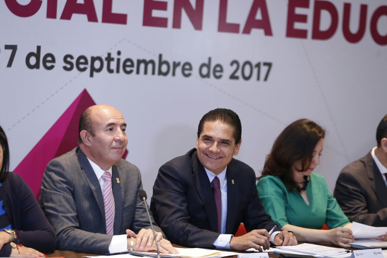 Morelia, Mich., 27 de septiembre de 2017.- La educación de la niñez y la juventud michoacanas tiene que mejorar y ser de calidad, ese es el interés supremo y en esa ruta no daremos ni un paso atrás, así lo demandan los retos y esa es nuestra responsabilidad, en la que debemos coadyuvar Gobierno y ciudadanía; pronunció el Gobernador Constitucional Silvano Aureoles Conejo.