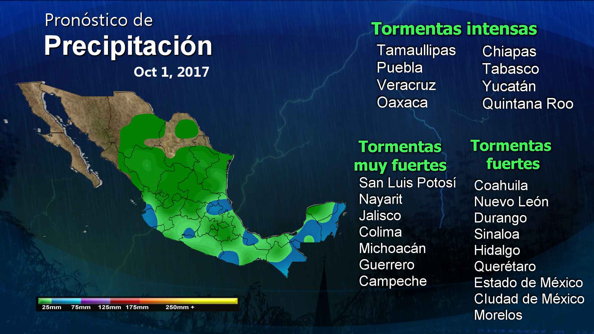 CDMX, 01 de octubre del 2017.- Durante esta noche de domingo y madrugada, se presentarán valores de temperatura menores a 5°C en zonas montañosas de Baja California, Sonora, Chihuahua, Durango, Zacatecas, Michoacán, Estado de México, Hidalgo, Puebla y Tlaxcala. Se prevé también, viento de componente norte con rachas superiores a 50 km/h en los litoral de Tamaulipas, Veracruz e Istmo de Tehuantepec. También se mantendrán nublados, asociados con actividad eléctrica, viento fuerte y acumulados de lluvias intensas en Tamaulipas, Puebla, Veracruz, Oaxaca, Chiapas, Tabasco, Yucatán y Quintana Roo; muy fuertes en San Luis Potosí, Nayarit, Jalisco, Colima, Michoacán, Guerrero y Campeche; fuertes en Coahuila, Nuevo León, Durango, Sinaloa, Hidalgo, Querétaro, Estado de México, Ciudad de México y Morelos, así como intervalos de chubascos en zona del norte del país. Tales condiciones serán originadas por el aire frío que impulsó al frente No. 3, a una zona de inestabilidad en el sureste del país y la abundante humedad de ambos litorales.