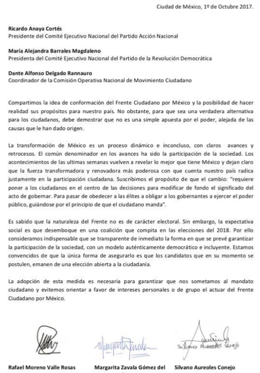 Margarita Zavala, Rafael Moreno Valle y Silvano Aureoles firmaron una misiva a Ricardo Anaya Cortés por el PAN, Alejandra Barrales del PRD y Dante Delgado del Movimiento Ciudadano para que se haga una “elección abierta ciudadana”.
