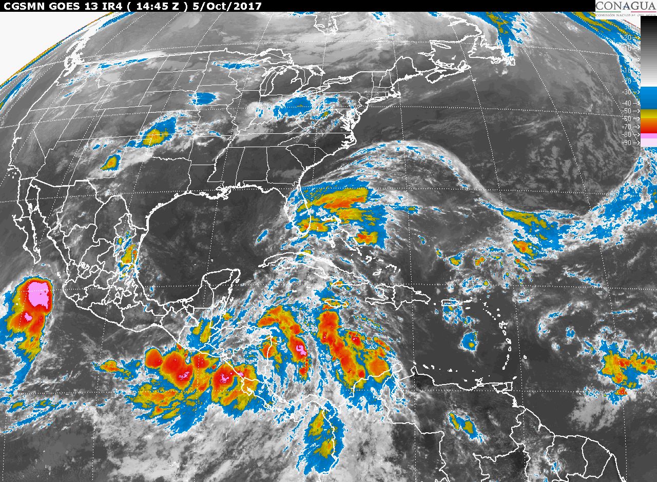 Golfo de México: Cielo nublado, 80% de probabilidad de tormentas intensas en Veracruz y muy fuertes en Tamaulipas y Tabasco. Bancos de niebla en regiones montañosas. Ambiente cálido por la tarde. Viento de componente norte de 15 a 30 km/h en la región, con rachas iguales o superiores a 50 km/h en Veracruz y Tabasco.