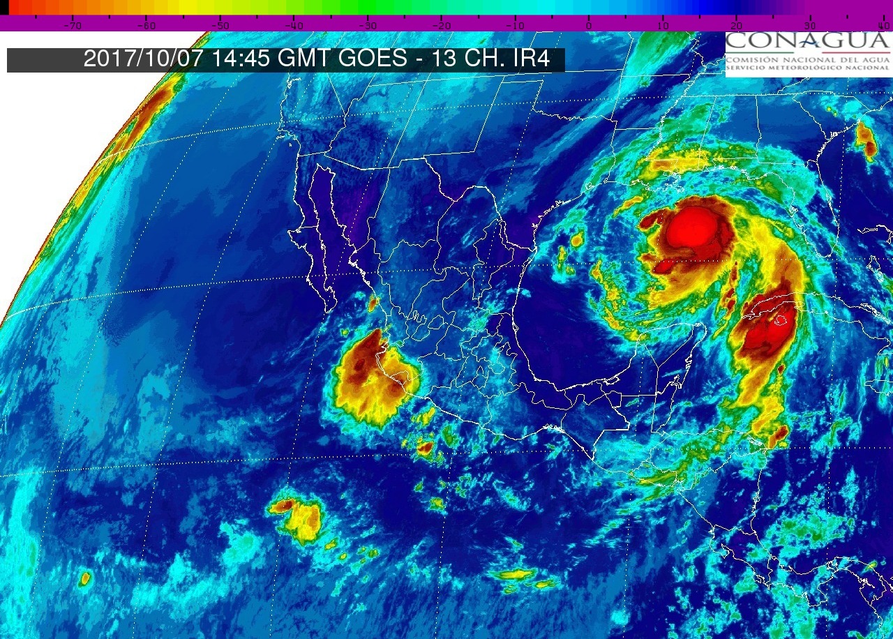CDMX, 07 de octubre del 2017.- Para hoy sábado, “Nate” con categoría de Huracán, se desplazará rápidamente hacia el nor-noreste, recorriendo el oriente y noreste del Golfo de México, alejándose de costas mexicanas. Mientras tanto, un sistema frontal se extenderá sobre los estados del noroeste y norte de México, ocasionando vientos de componente norte con rachas iguales o superiores a 50 km/h en dichas regiones. Asimismo, nublados densos se desarrollarán por la tarde, favoreciendo tormentas muy fuertes a intensas en el noroeste, occidente y sureste del país, con el siguiente potencial de lluvias: