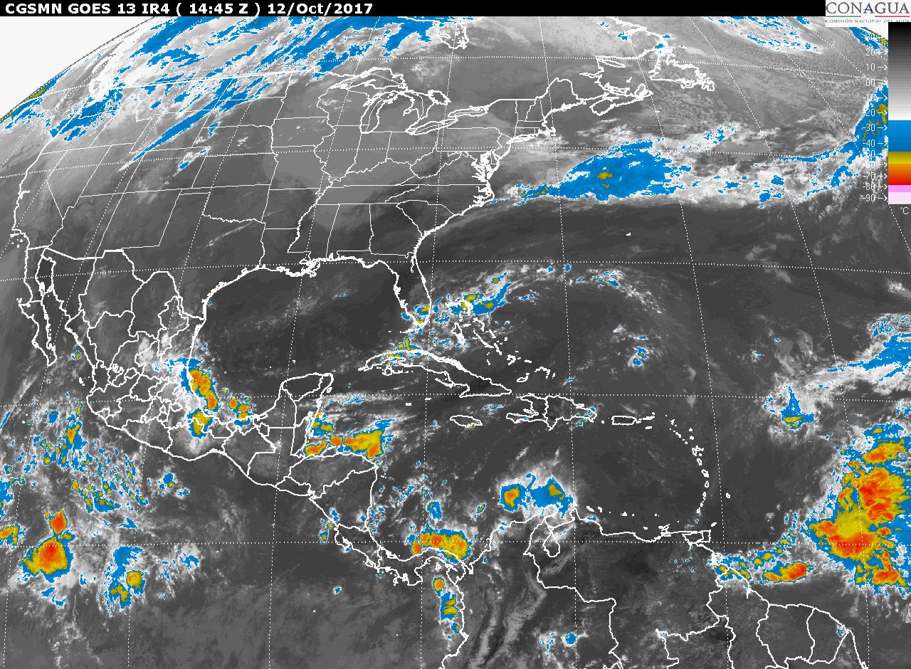 CDMX, 12 de octubre del 2017.- Para hoy jueves, el sistema frontal no. 4 continuará sobre el occidente del Golfo de México, por su parte, la masa de aire frío asociado al frente mantendrá el ambiente frío en estados del noreste, centro y oriente de México. Asimismo, un canal de baja presión sobre el occidente del territorio nacional y otro en la Península de Yucatán, también favorecerán el siguiente potencial de tormentas: