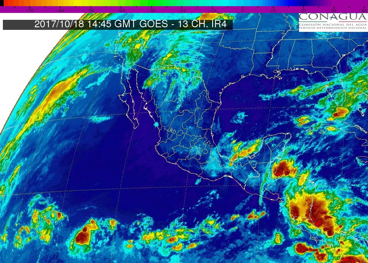 CDMX, 18 de octubre del 2017.- Para hoy miércoles, el frente No. 5 se extenderá como estacionario desde el oriente del Golfo de México hasta el sur de Veracruz y Tabasco. La masa de aire frío que lo impulsa, mantendrá bajos valores de temperatura en el norte, noreste, oriente y centro del país, así como evento de “Norte” de 25 a 35 km/h con rachas superiores a 50 km/h en el centro y sur del Golfo de México, Istmo y Golfo de Tehuantepec (Oaxaca y Chiapas). Dichos sistemas favorecerán el siguiente potencial de lluvias: