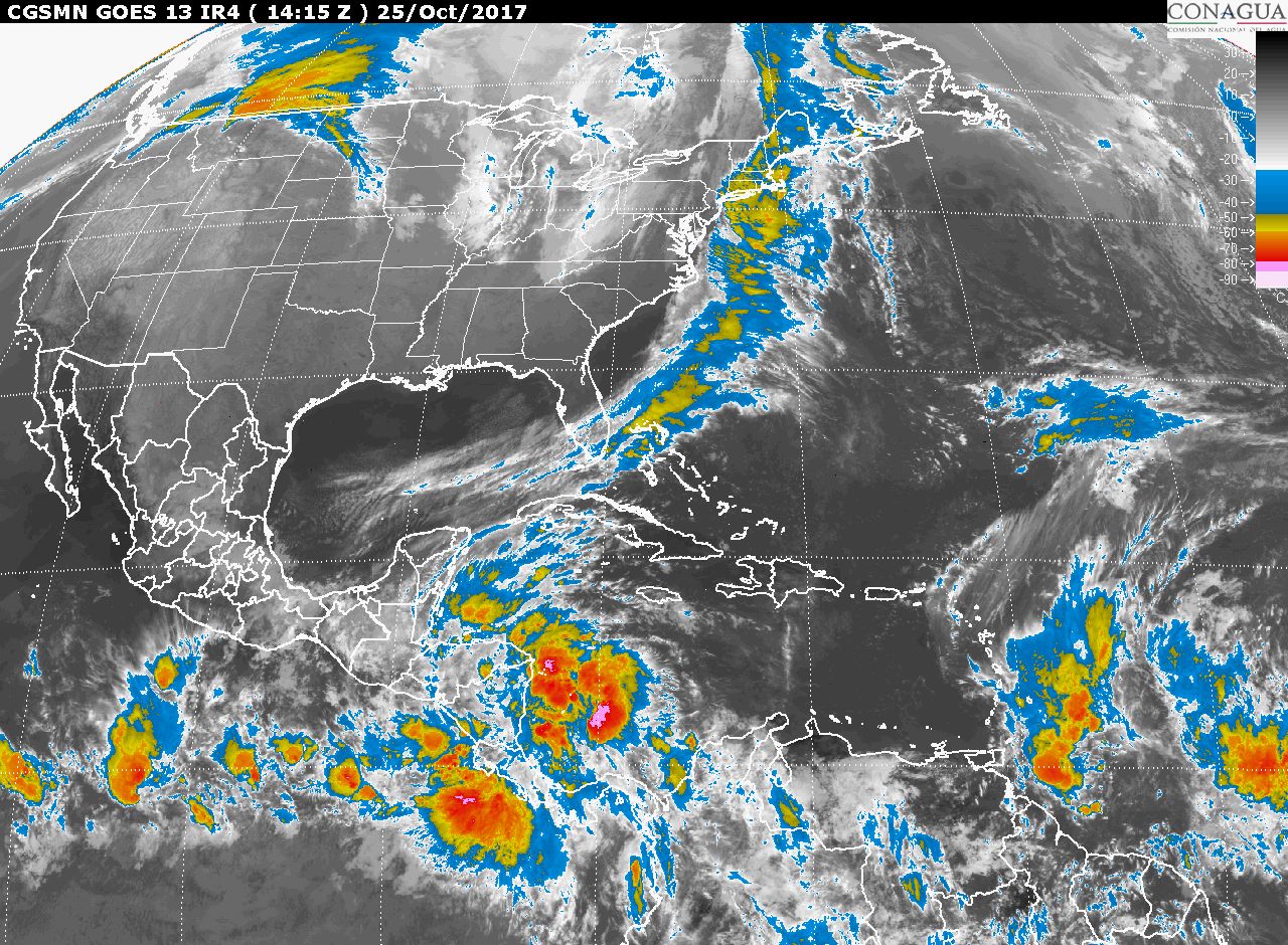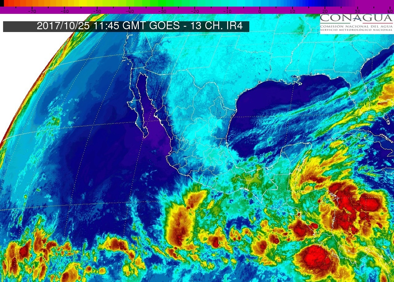 CDMX, 25 de octubre del 2017.- Para hoy miércoles el frente frío No. 6 se extenderá desde el oriente de Estados Unidos hasta el sur de la Península de Yucatán, y su masa de aire frío reforzada mantendrá bajos valores de temperaturas en los estados del norte, noreste, oriente y centro de México, así como evento de “Norte” con rachas de viento superiores a 80 km/h en el Istmo y Golfo de Tehuantepec (Oaxaca y Chiapas) y de 60 km/h en las costas del Golfo de México y Península de Yucatán. Por lo anterior se prevé el siguiente potencial de lluvias:Pronóstico de precipitación máxima (acumulada en 24 h) para hoy 25 de octubre de 2017: