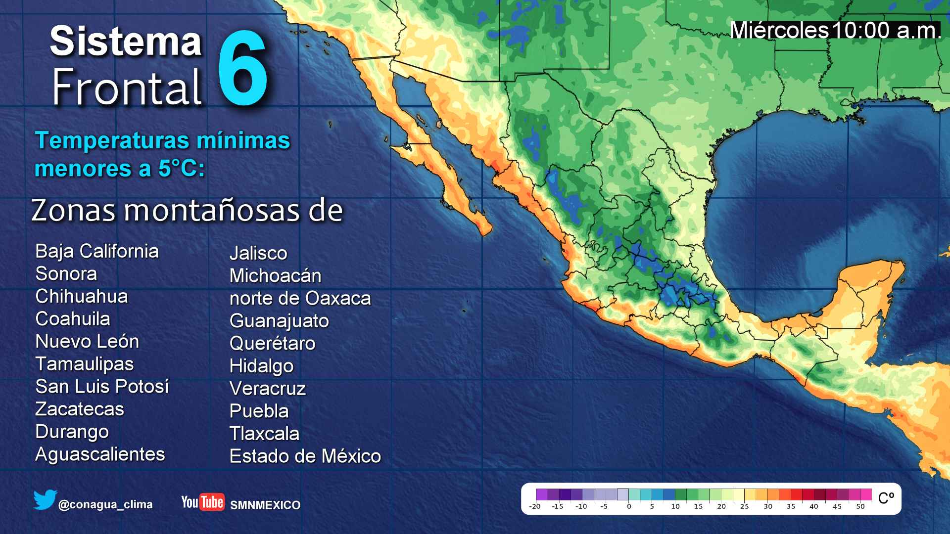 Temperaturas mínimas menores a 5°C: Zonas montañosas de Baja California, Sonora, Chihuahua, Coahuila, Nuevo León, Tamaulipas, San Luis Potosí, Zacatecas, Durango, Aguascalientes, Jalisco, Michoacán, norte de Oaxaca, Guanajuato, Querétaro, Hidalgo, Veracruz, Puebla, Tlaxcala y Estado de México.