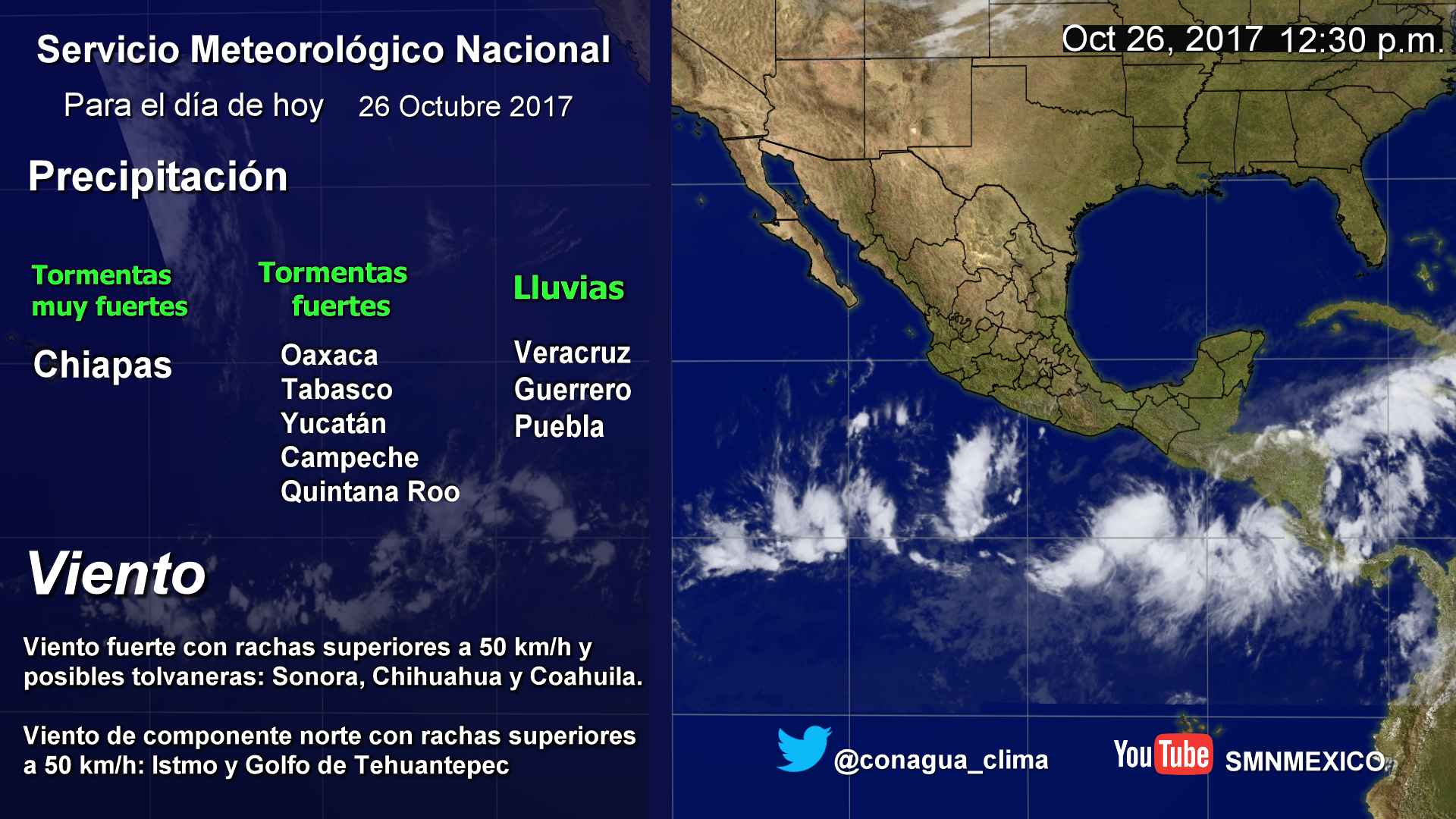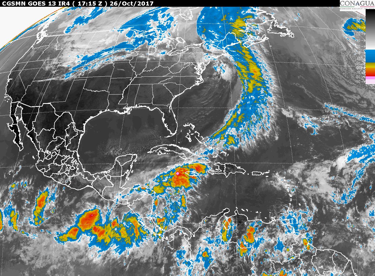 CDMX, 26 de octubre del 2017.- Para hoy miércoles, la masa de aire frío que impulsó al frente frío No. 6 mantendrá bajos valores de temperaturas en los estados del norte, noreste, oriente y centro de México, así como viento de componente norte con rachas superiores a 50 km/h en el Istmo y Golfo de Tehuantepec (Oaxaca y Chiapas). Por otra parte, una zona de inestabilidad en el norte de México, originará viento fuerte con rachas superiores a 50 km/h y posibles tolvaneras en Sonora, Chihuahua y Coahuila. Finalmente dos zonas de inestabilidad con potencial ciclónico mantendrán el ingreso de humedad hacia el sureste del país y Península de Yucatán, por lo que se prevé el siguiente potencial de lluvias:Pronóstico de precipitación máxima (acumulada en 24 h) para hoy 26 de octubre de 2017: