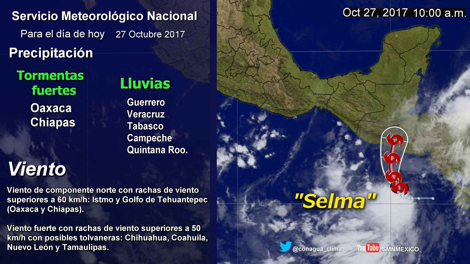 CDMX, 27 de octubre del 2017.- Para hoy viernes, el frente frío No. 7 se extenderá sobre los estados fronterizos del norte y noreste de México, provocara rachas fuertes de viento en Chihuahua, Coahuila, Nuevo León y Tamaulipas. La masa de aire frío que le dará impulso favorecerá un descenso de temperatura en el norte y noreste de la República. Finalmente, la Tormenta Tropical «Selma» y una zona de inestabilidad con potencial ciclónico en el Mar Caribe, ocasionarán el ingreso de humedad hacia el sureste del país y Península de Yucatán, por lo que se prevé el siguiente potencial de lluvias: