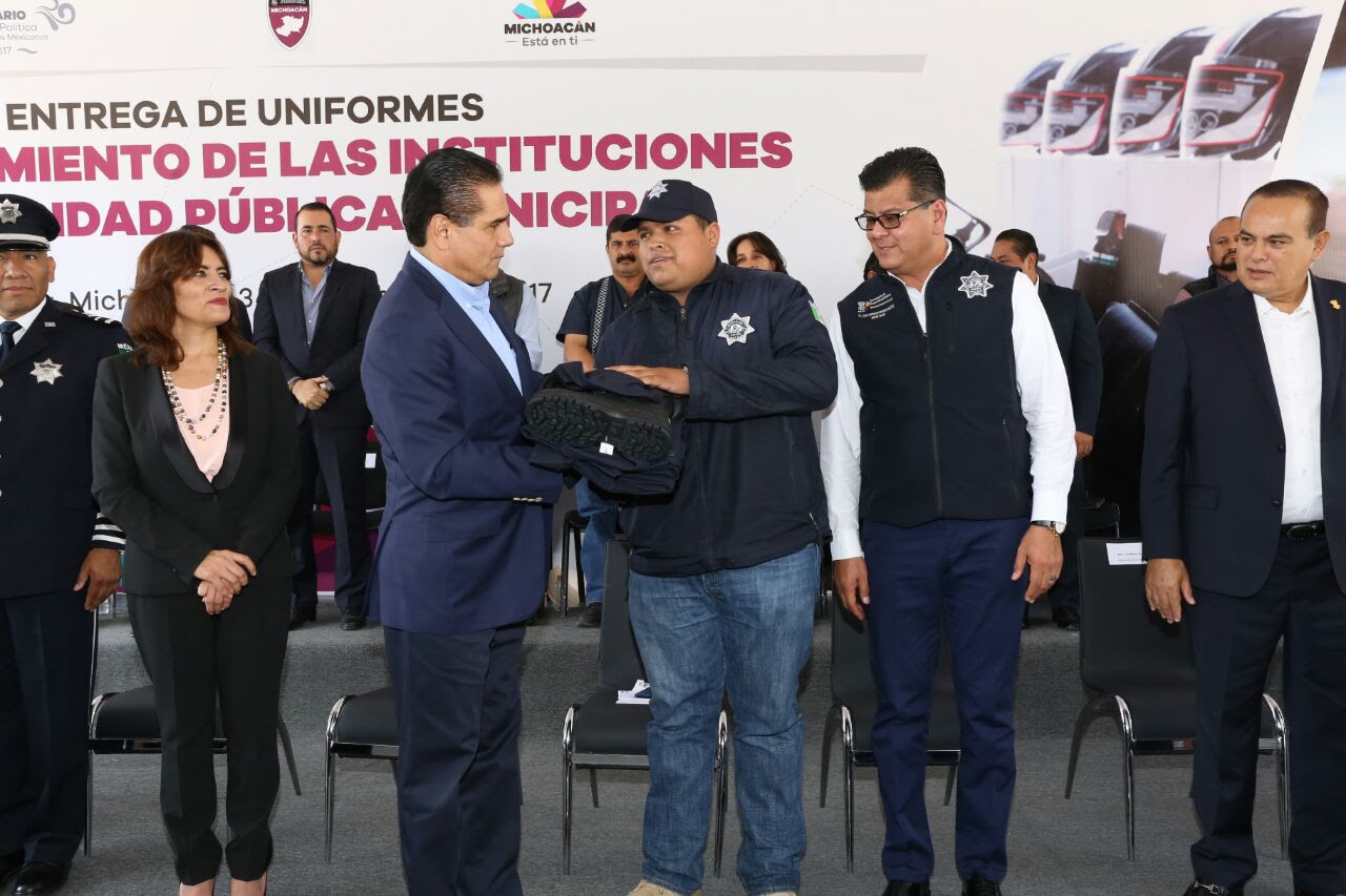 Morelia, Mich., 03 de noviembre de 2017.-El Gobernador Constitucional Silvano Aureoles Conejo presidió esta mañana la entrega de 2 mil 314 uniformes, destinados a policías de 102 municipios michoacanos, como parte del Fortalecimiento de las Instituciones de Seguridad Pública Municipales, con una aportación de Estado y Federación cercana a los 9 millones de pesos.
