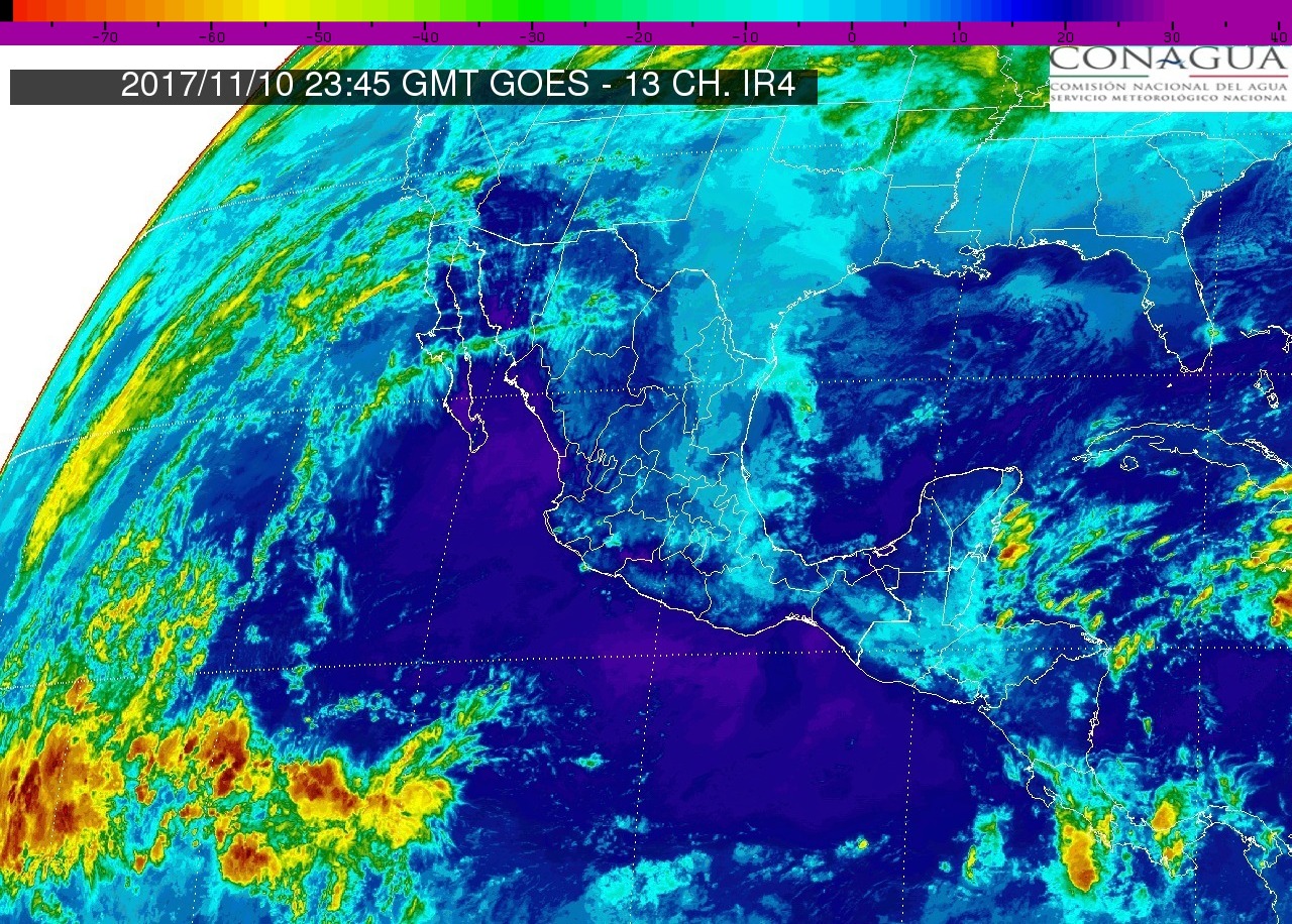CDMX, 10 de noviembre del 2017.- Para esta noche de viernes, el sistema frontal No. 9, se extiende con características de estacionario sobre el Golfo de México y sureste del país, ocasionará tormentas fuertes a puntuales muy fuertes en Tamaulipas, Veracruz, Puebla, Oaxaca, Chiapas, Tabasco, Campeche y Quintana Roo. Su masa de aire frío mantendrá valores bajos de temperatura en el norte, noreste y centro del territorio, además de bancos de niebla y neblina, así como evento de “Norte” con rachas superiores a 50 km/h en el litoral del Golfo de México, y rachas superiores a 70 km/h en el Istmo y Golfo de Tehuantepec.
