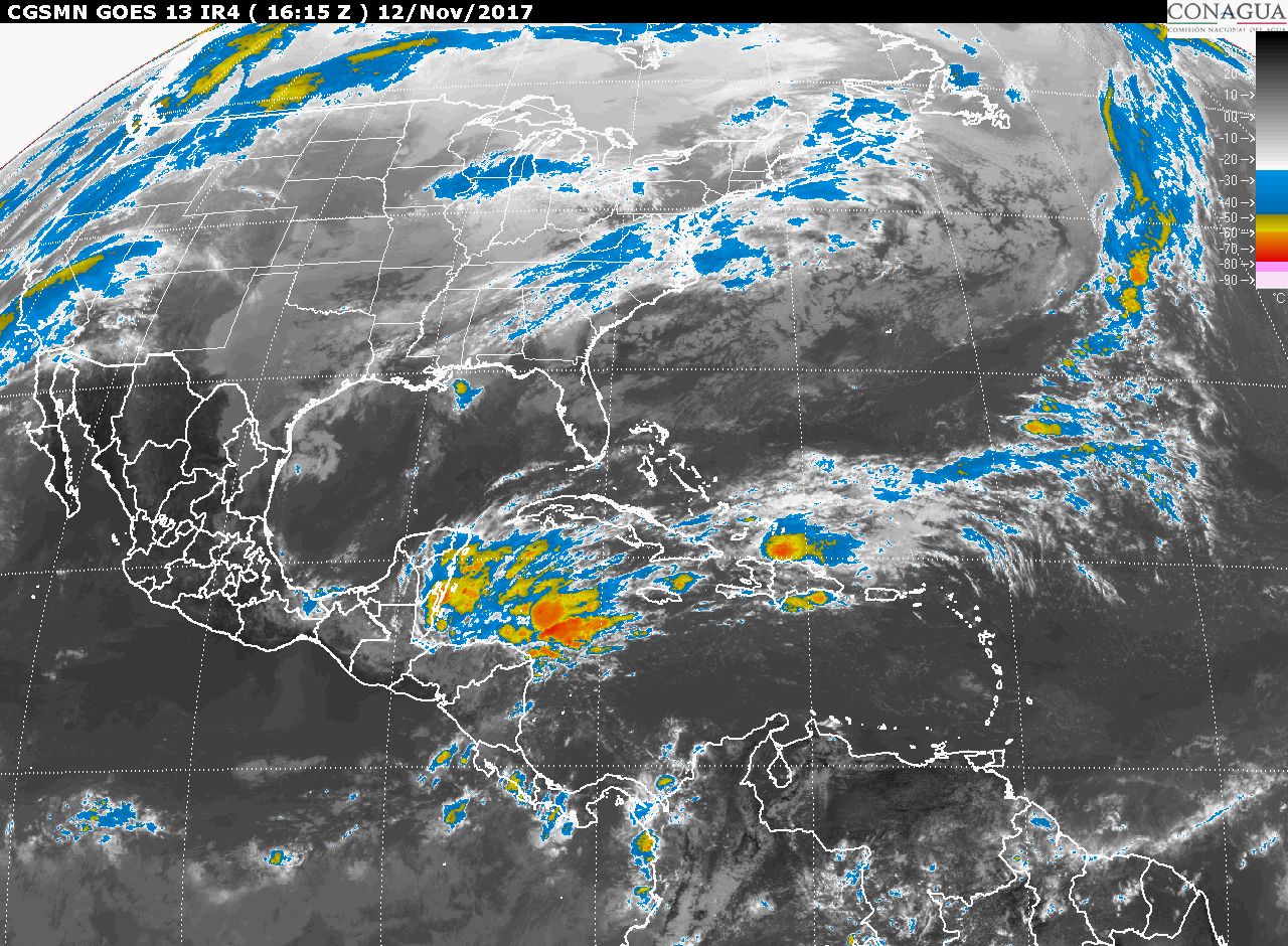 CDMX, 12 de noviembre del 2017.- Para hoy domingo, un nuevo frente frío se aproximará a la frontera norte del país. Se registrarán vientos de componente norte con rachas superiores a 70 km/h en el Istmo y Golfo de Tehuantepec, así como rachas mayores a 50 km/h en la Península de Yucatán. Finalmente, una zona de inestabilidad en el suroeste del Golfo de México ocasionará el aumento de nublados con el siguiente potencial de lluvias: