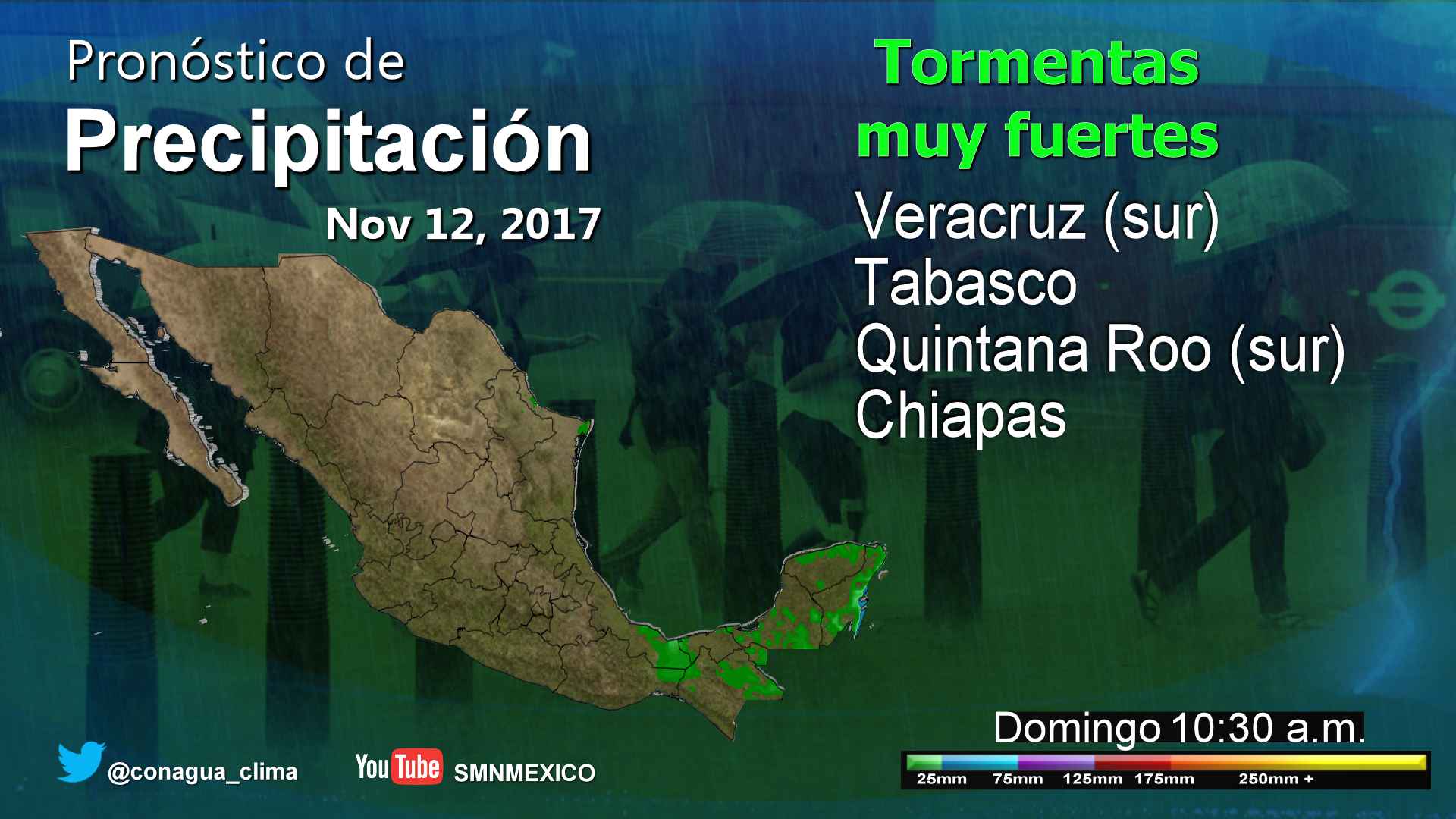 Tormentas fuertes con puntuales muy fuertes (50 a 75 mm): Veracruz (sur), Tabasco, Chiapas y Quintana Roo (sur).