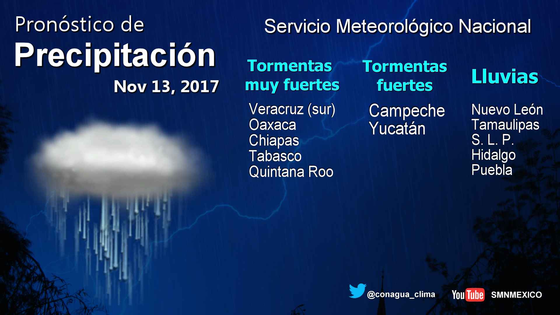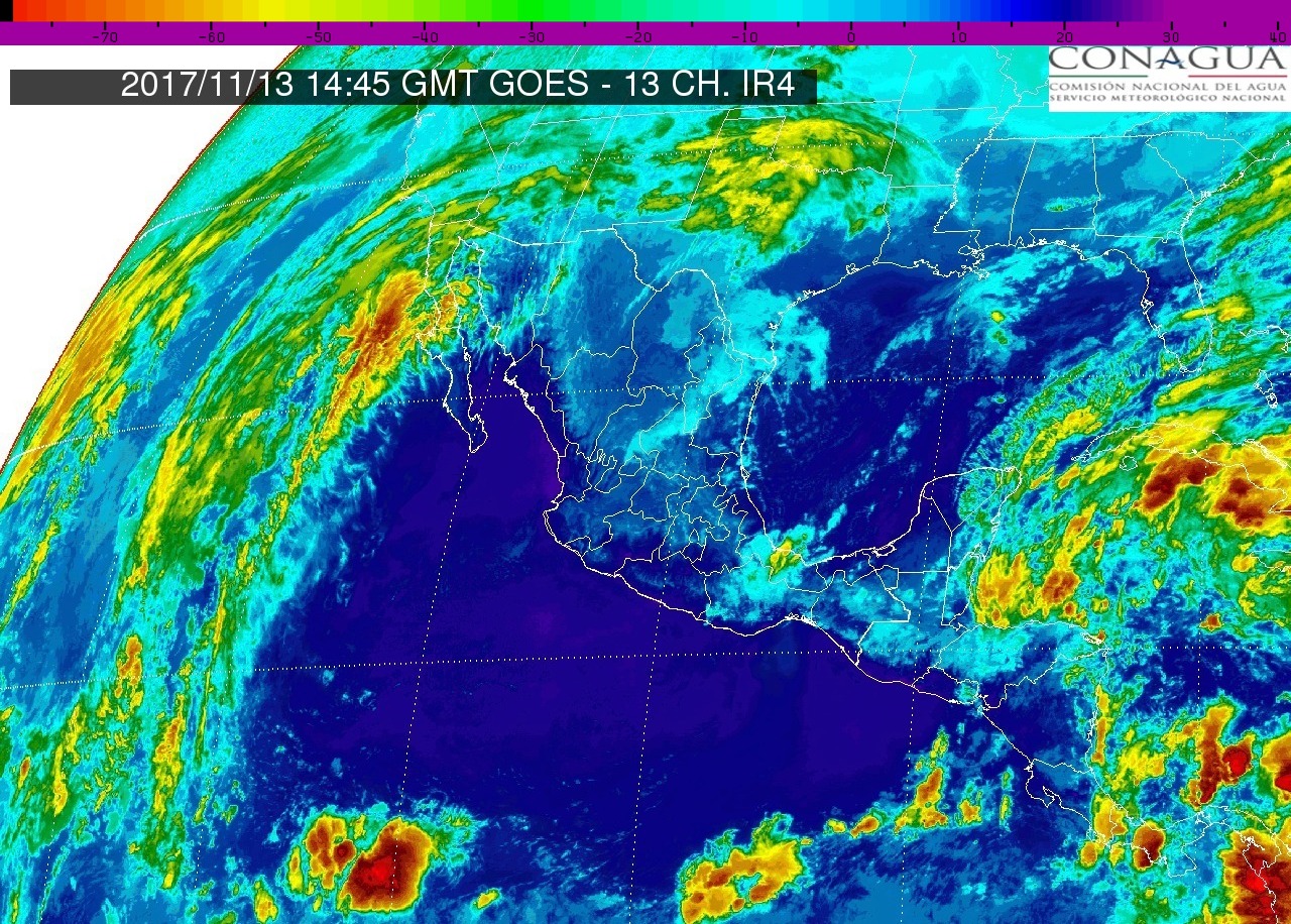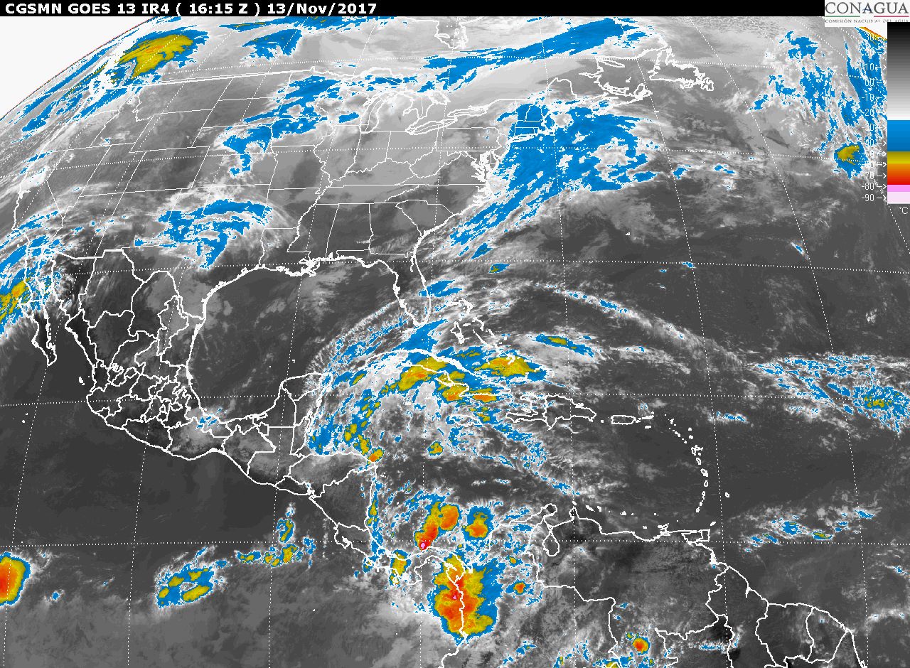 CDMX, 13 de noviembre del 2017.- Para hoy lunes, una zona de inestabilidad se localizará en el suroeste del Golfo de México y el sureste del país y un canal de baja presion en el Mar Caribe. Ademas de la masa de aire frío que domina los estados del noreste, oriente y centro del país, así como rachas de viento superar a 50 km/h en el litoral del Golfo de México, incluyendo la Península de Yucatán, y superiores a 60 km/h en el Istmo y Golfo de Tehuantepec. Por lo que se prevé el siguiente potencial de lluvia: