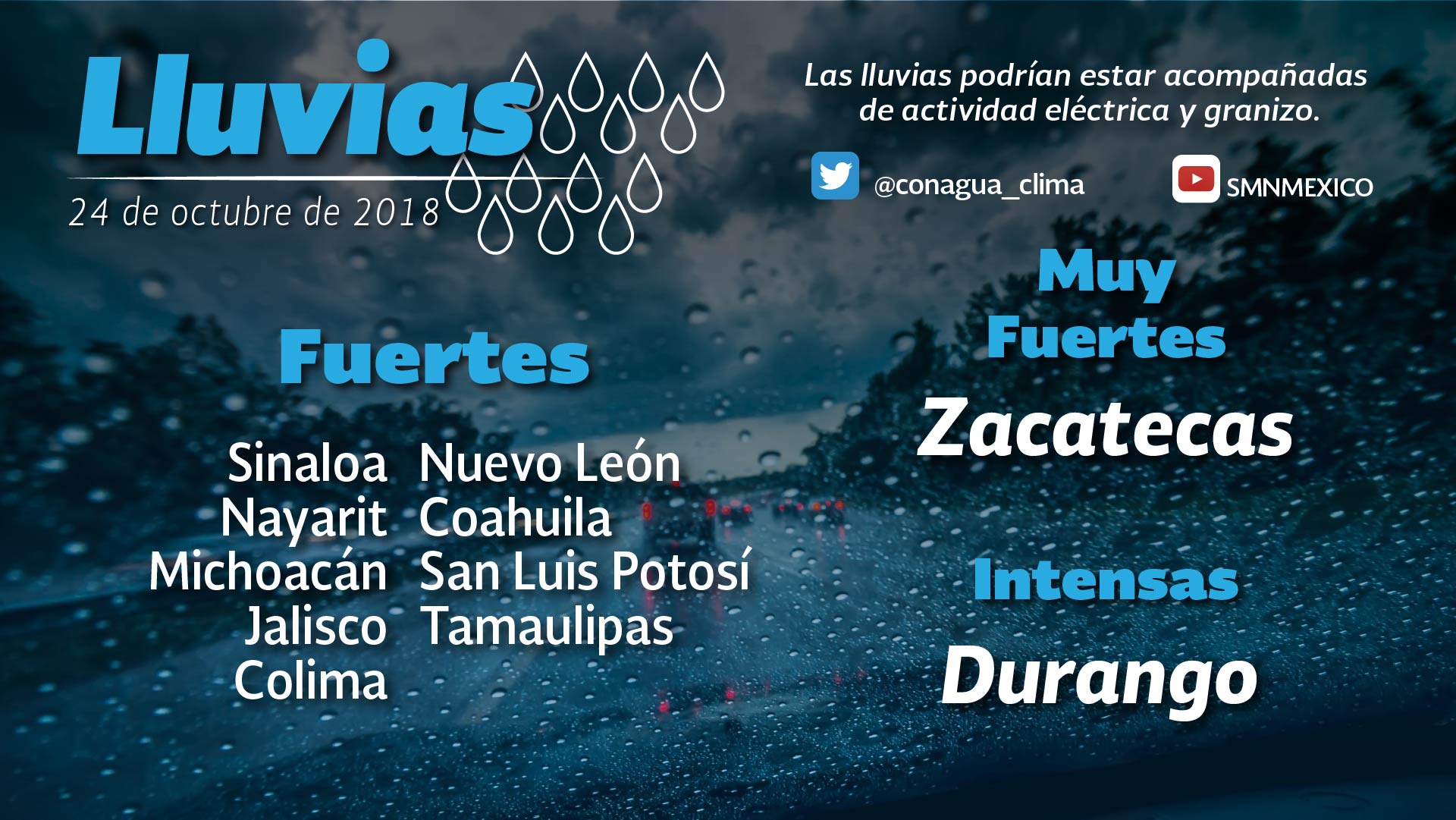 Mesa del Norte: Cielo nublado con tormentas puntuales intensas en Durango, puntuales muy fuertes en Coahuila y Nuevo León, así como puntuales fuertes en Zacatecas y San Luis Potosí, las cuales se acompañarán de actividad eléctrica, así como lluvias con intervalos de chubascos en Chihuahua y Aguascalientes. Ambiente cálido durante el día en gran parte de la región, con vientos de dirección variable de 20 a 35 km/h, así como rachas superiores a 50 km/h en Durango, Zacatecas y Coahuila.