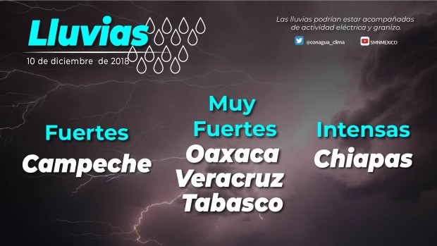 CDMX, 10 de diciembre del 2018.- Para hoy lunes, el sistema frontal No. 16 se extenderá sobre la Península de Yucatán y sureste de México. La masa de aire frío asociada al frente, provocará ambiente frío en gran parte del país, bancos de niebla en el oriente, centro y sureste, así como evento de “Norte” con rachas de viento que pueden superar los 60 km/h en el sur del litoral del Golfo de México y rachas superiores a 80 km/h en el Istmo y Golfo de Tehuantepec (Oaxaca y Chiapas), además se prevé el siguiente potencial de lluvias:Pronóstico de precipitación máxima (acumulada en 24 h) para hoy 10 de diciembre de 2018: