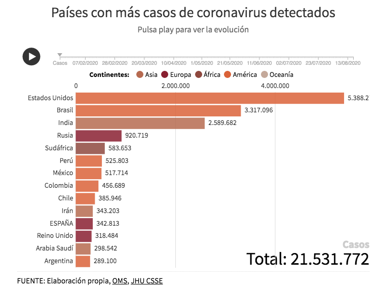 El país más afectado es Estados Unidos, con 5.388,200 contagios y 169,841 fallecimientos, seguido de Brasil, que suma los 3,317,096 casos y 107,232 muertos, y de India, con 2.589,682 contagios y 49,980 muertes. Por debajo se sitúan Rusia, que llega a los 920,719 infectados y registra 15,653 muertos; Sudáfrica, con más de 583.000 casos; Perú, que sobrepasa los 525.000; México, que excede los 517.000 casos; Colombia, por encima de los 456.000; y Chile, con más de 385.000 casos.