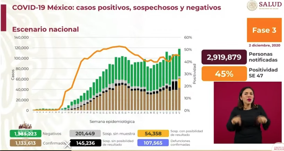 CDMX, 02 de diciembre del 2020.- Autoridades de la Secretaría de Salud federal informaron que México registró 11,251 nuevos casos de Covid-19, con lo cual da un acumulado de 1,133,613 contagios.