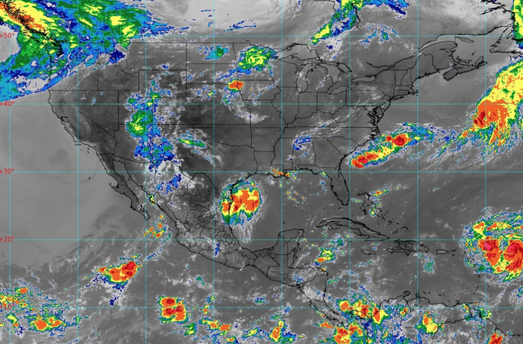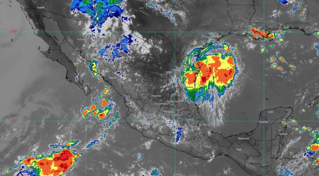 A su vez, un canal de baja presión sobre la Mesa del Norte y la Mesa Central, y el ingreso de aire húmedo del océano Pacífico y golfo de México, propiciarán lluvias puntuales muy fuertes en Estado de México, Querétaro, Guanajuato y Jalisco; puntuales fuertes en Veracruz, Oaxaca, Puebla, Tlaxcala, Morelos, Ciudad de México, Hidalgo, Colima, Aguascalientes y Zacatecas; además de chubascos en San Luis Potosí, Nuevo León y Coahuila.