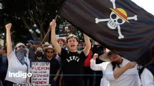 La falta de manifestantes no impidió que sí llegaran puntuales a la cita, una decena de vendedores que ofrecían banderas con la imagen del manga One Piece, sombreros con moño negro y banderas de México con el rostro de Carlos Manzo.