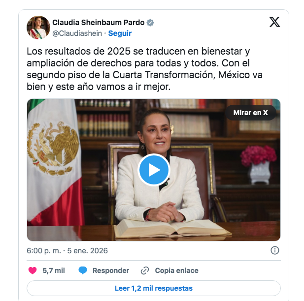 En seguridad, informó una reducción del 37% en homicidios dolosos.La mandataria cerró su mensaje con un balance cultural y social, asegurando que “México va bien” y que en 2026 los avances continuarán, con una visión de futuro apoyada en derechos, bienestar y desarrollo con justicia social.