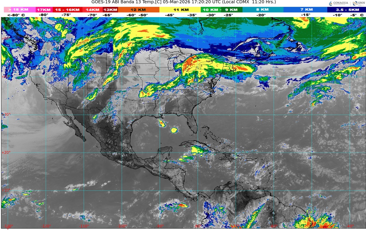 CDMX, 05 de marzo del 2026.- Para hoy jueves, una línea seca sobre el noreste del territorio nacional, ocasionará lluvias puntuales fuertes, descargas eléctricas, posible caída de granizo, además de fuertes rachas de viento en dicha región, con probabilidad de torbellinos en el norte de Coahuila y Nuevo León.
