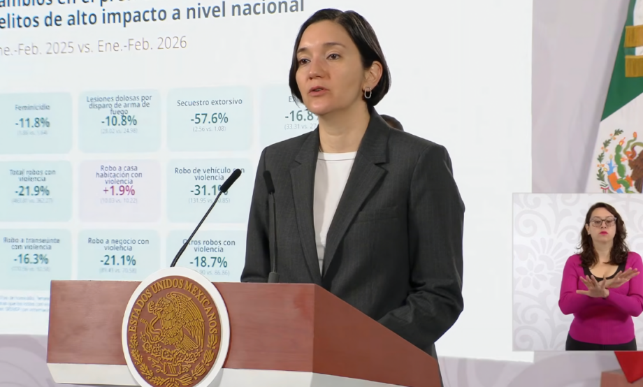 CDMX, 10 de marzo del 2026.- El promedio diario de homicidios dolosos en México disminuyó 44% desde septiembre de 2024, al pasar de 86.9 asesinatos diarios a 48.8 en lo que va de de 2026, informó Marcela Figueroa, titular del Secretariado Ejecutivo del Sistema Nacional de Seguridad Pública (SNSP).