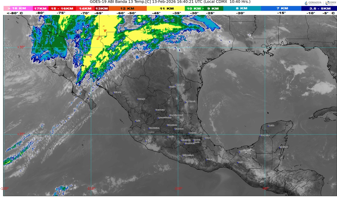 MX, 13 de febrero del 2026.- Para hoy viernes, el frente frío núm. 34 se desplazará sobre el noroeste y norte de la República Mexicana, interaccionará con la vaguada polar y con las corrientes en chorro polar y subtropical, ocasionarán vientos fuertes a muy fuertes, lluvias y chubascos en dichas regiones, además de lluvias puntuales fuertes en Sonora y Chihuahua; así como posible caída de nieve o aguanieve en las sierras de Baja California, Sonora y Chihuahua.